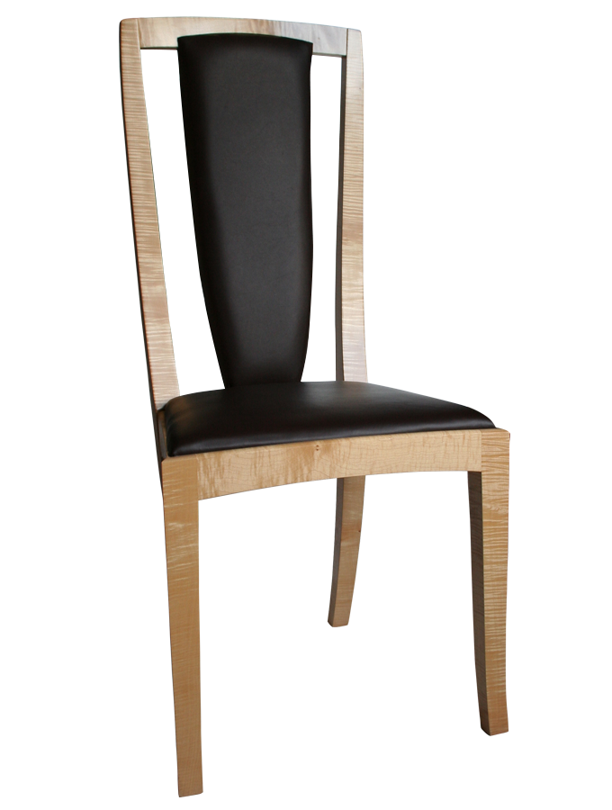 Prime ripple sycamore, upholstered in leather. With this design Paul's aim was to bring the enhancing elegant subtilties used in late 18th century Georgian designs, but bring them into today with a paring away of the traditional decorative elements.