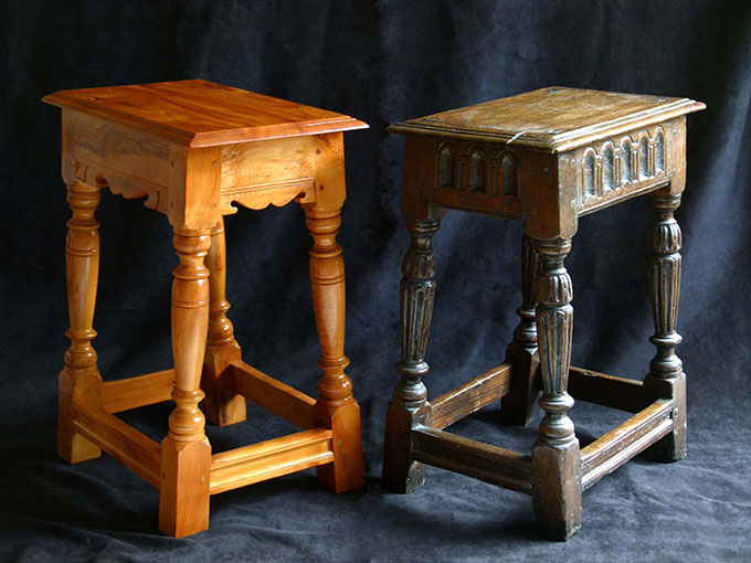 Here we have a pair of traditional joint stools - the one on the left is in yew wood and without any distressing to age the surface. The stool on the right is distressed comprehensively. The use of such techniques can help newly commissioned work sit well alongside antiques.